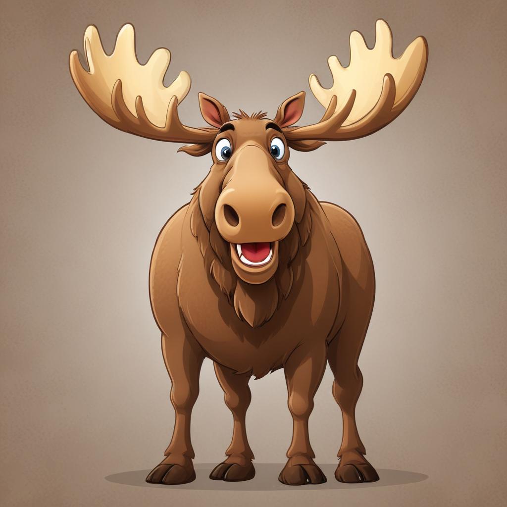A cartoon moose with large antlers stands on a light brown background. It is looking directly at the camera and smiling with its mouth open.