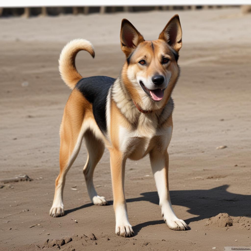 A medium-sized dog with brown, black, and white fur stands on a sandy beach with its tail curled.