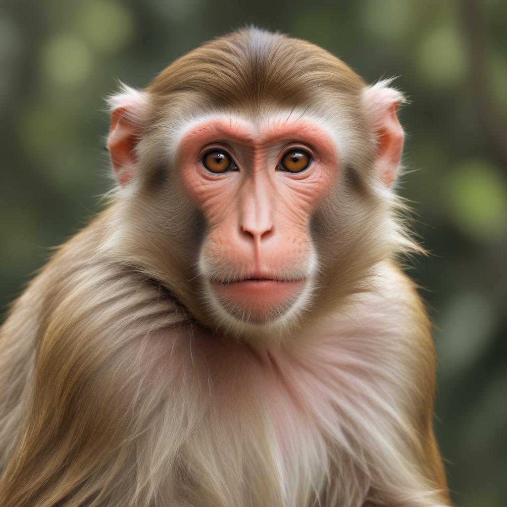 A close-up portrait of a monkey looking directly at the viewer. The monkey has a light brown coat and a pink face