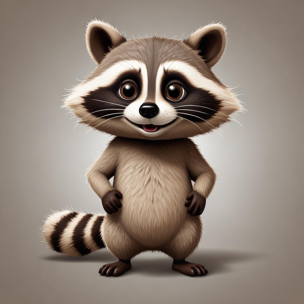 A cartoon raccoon is shown standing with its paws on its hips, smiling brightly. Its fur is a light brown, and it has a black mask around its eyes