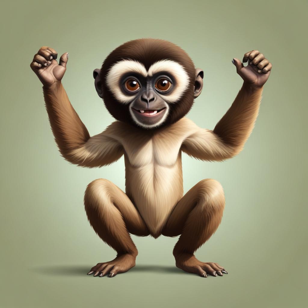 A cartoon gibbon with brown fur and a white face sits with its arms raised in the air, doing a squat with a big smile on its face.