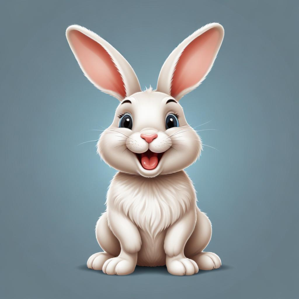 A cartoon image of a white rabbit sitting on a plain blue background. The rabbit has large, pink ears and is smiling with its mouth open