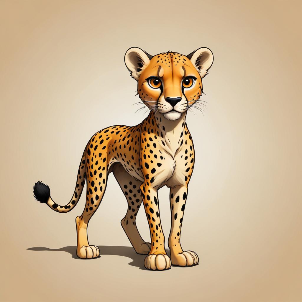 A cartoon cheetah stands upright on a tan background. It has black spots all over its body, a black tail, and a serious expression on its face.