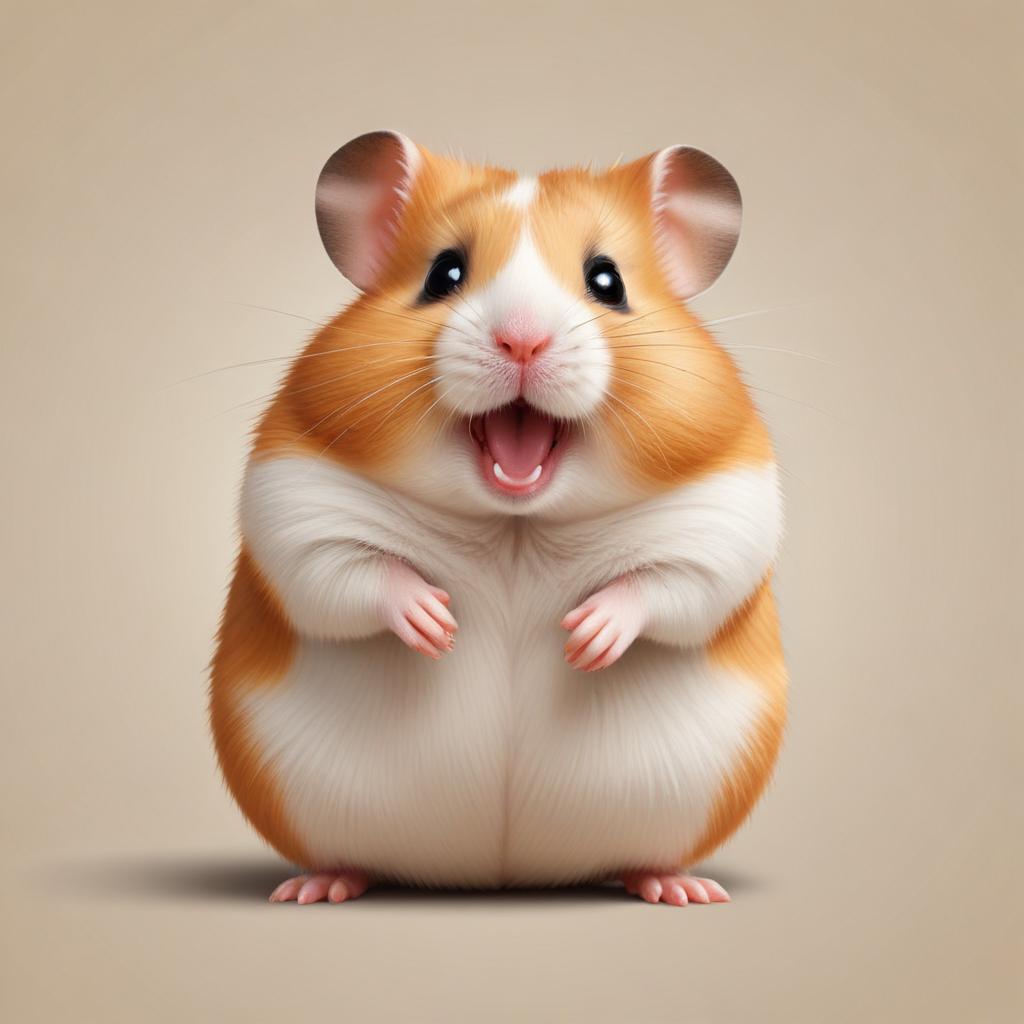 A hamster sits on a light brown background with a big smile. It has small pink ears, a white underbelly, and large black eyes