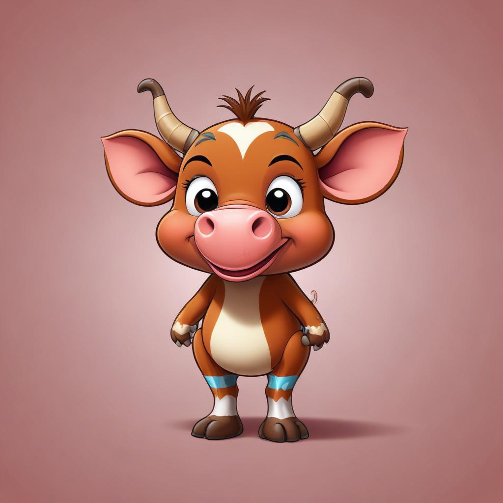 animal, art, background, big, brown, cartoon, character, cow, cute, design, digital, drawing, eyes, farming, happy, illustration, livestock, pink, smile, standing