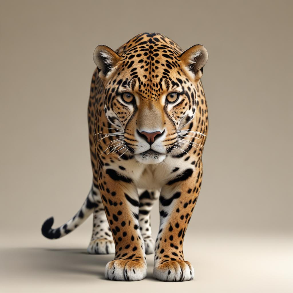 A jaguar walks towards the camera in a studio