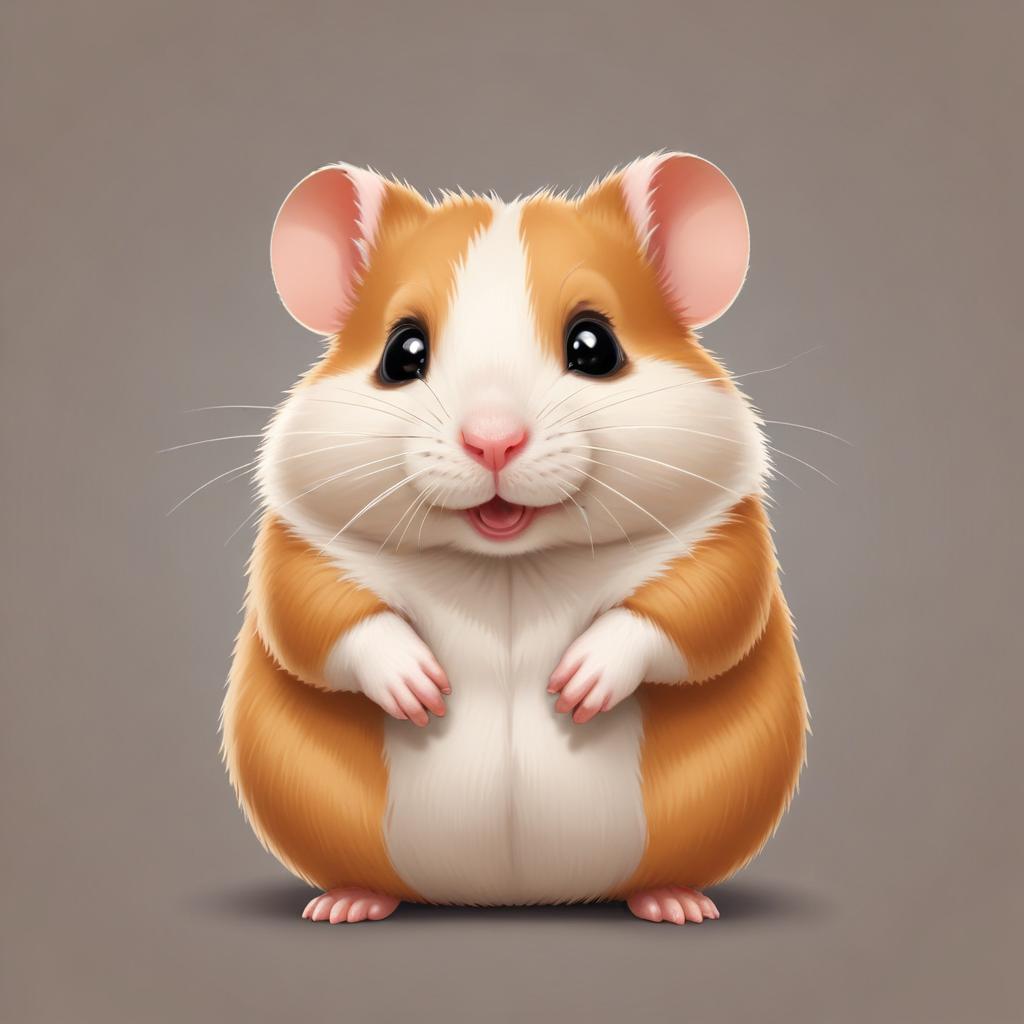 A small, furry hamster with large eyes smiles and stands on a gray background. It has a white belly and orange fur on its back.