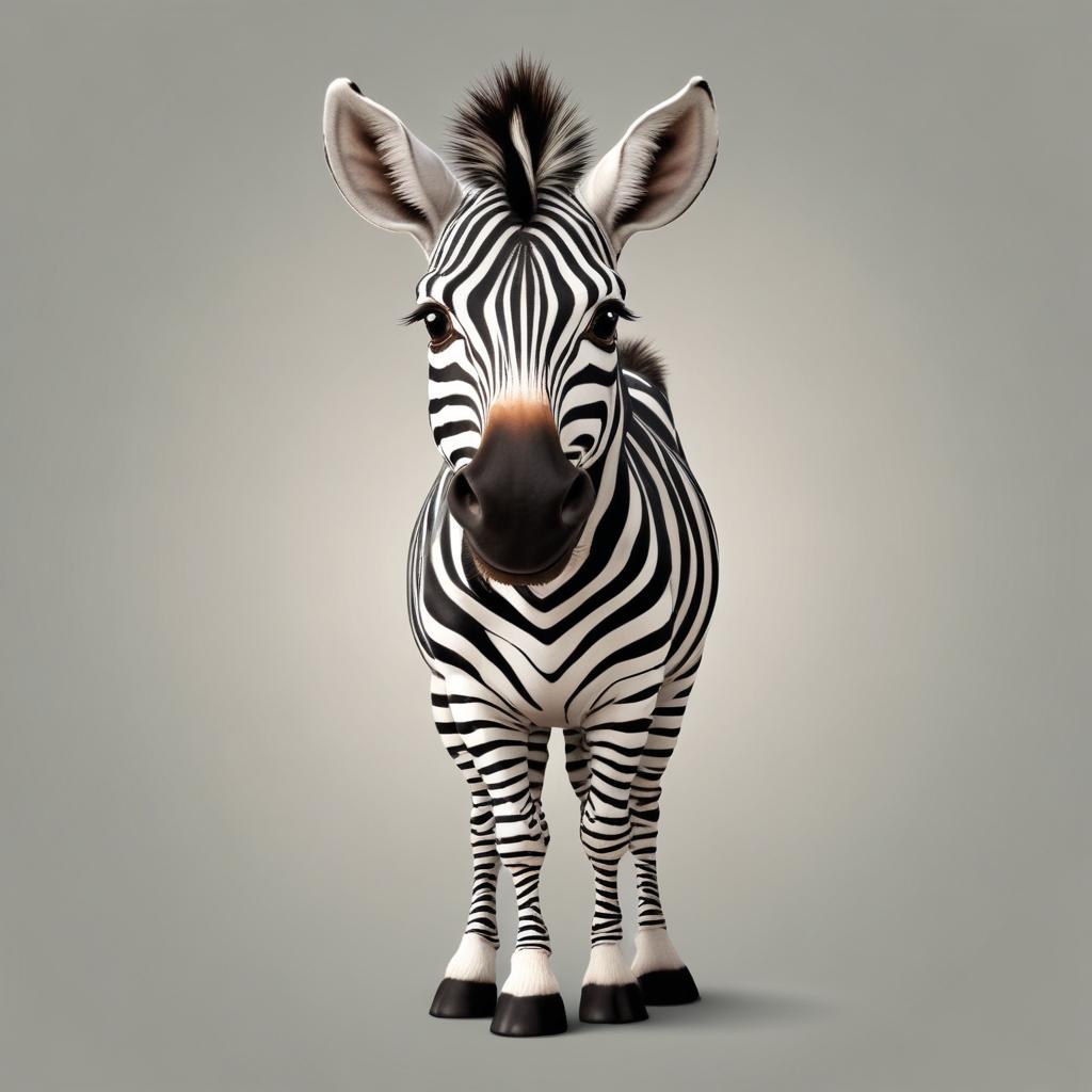 A zebra with black and white stripes is standing on a plain gray background. The zebra is looking directly at the camera.