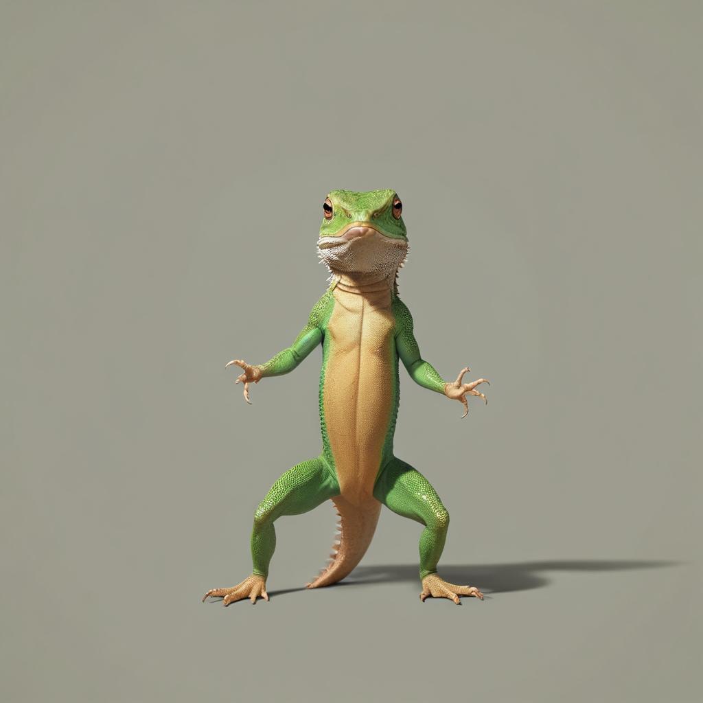 A green lizard stands on its hind legs in front of a grey background.