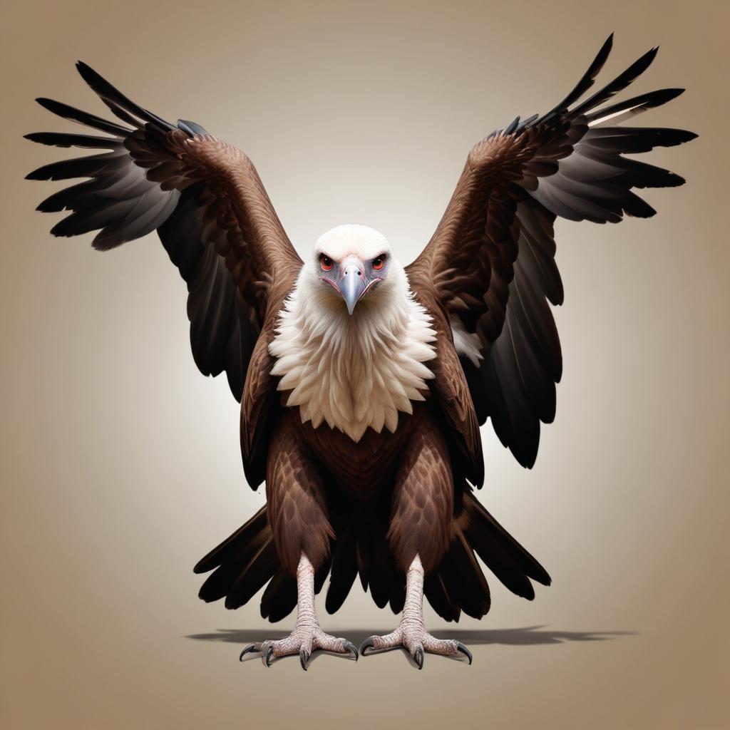 A large eagle with a white head and brown wings stands on a light background, wings spread wide, with a serious expression.