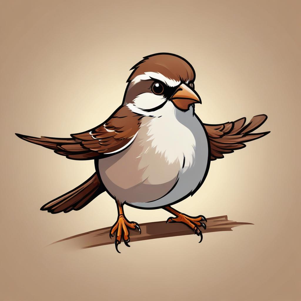 A cartoon-style sparrow stands on a branch. It has brown and white feathers and is facing the right of the image