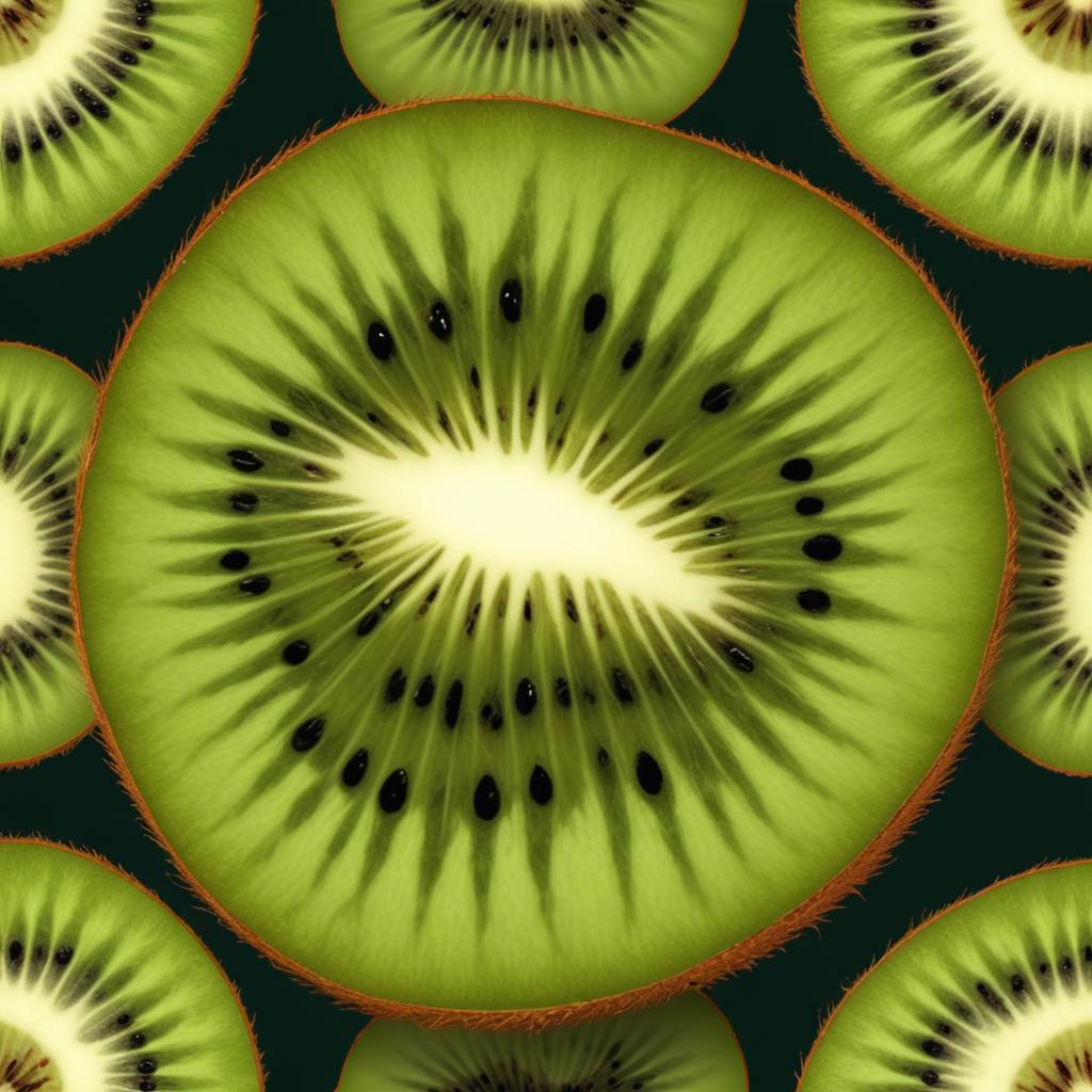 A close-up view of a kiwi fruit, sliced in half