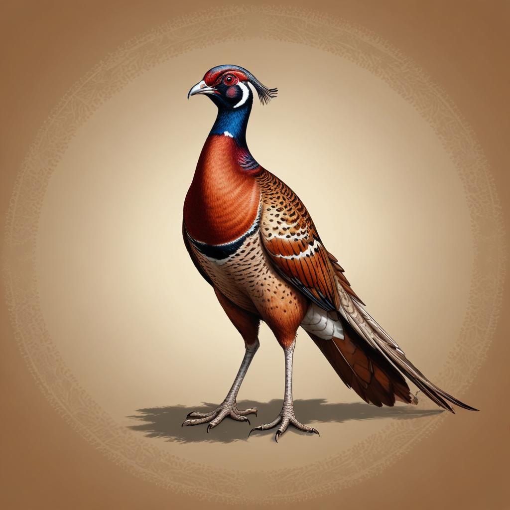 A brown pheasant with blue and white markings on its neck stands on a tan background. Its feathers have a brown and white spotted pattern