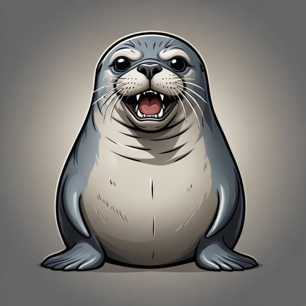 A cartoon illustration of a gray seal with large, dark eyes and a wide, open mouth. It is sitting on a light gray background.