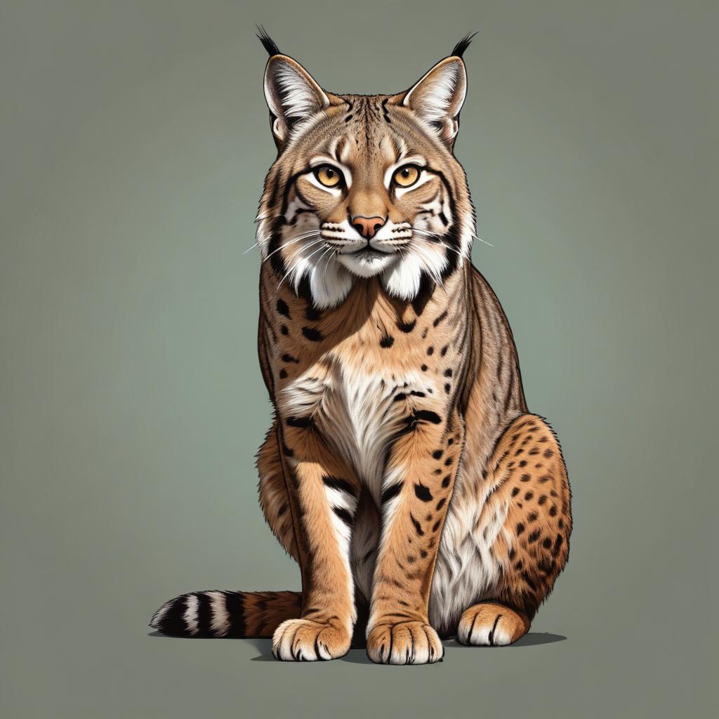 A lynx with a thick coat of brown and black fur sits facing the viewer with its paws in front of it.