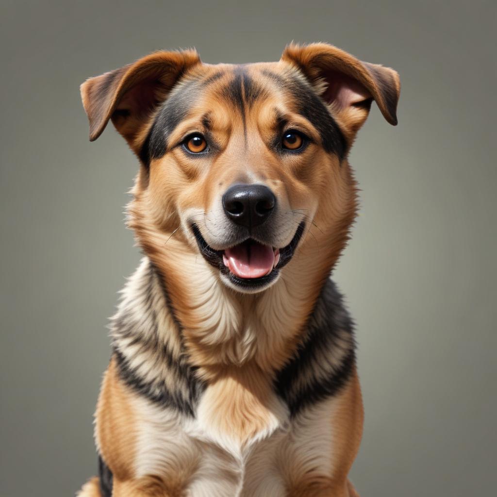 animal, background, black, brown, canine, coat, dog, ears, eyes, fur, gray, happy, mouth, pet, portrait, sitting, smile, studio, tongue, white