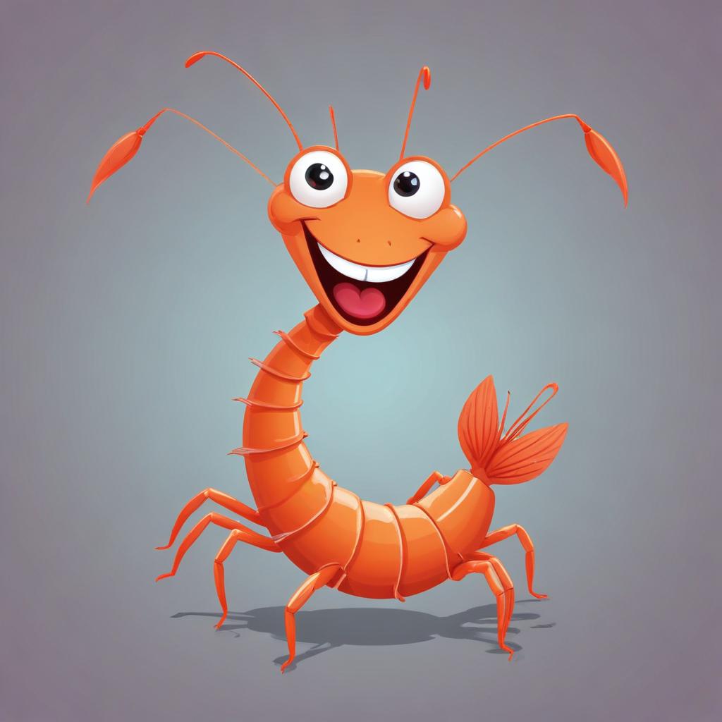 A cartoon shrimp with large, wide eyes smiles broadly with its mouth open. It is standing on its legs and its tail is curled to one side.