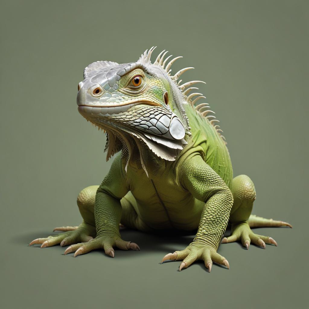 A green iguana with a spiky crest sits on a green background. The iguana is facing the right side of the frame and has its legs stretched out.