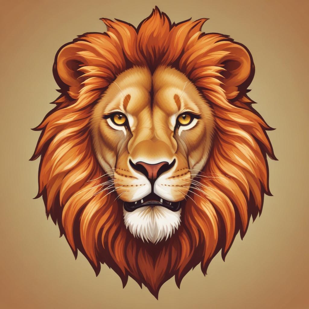 The image shows a close-up illustration of a lion's head. The lion has a large mane of orange fur and is looking directly at the viewer