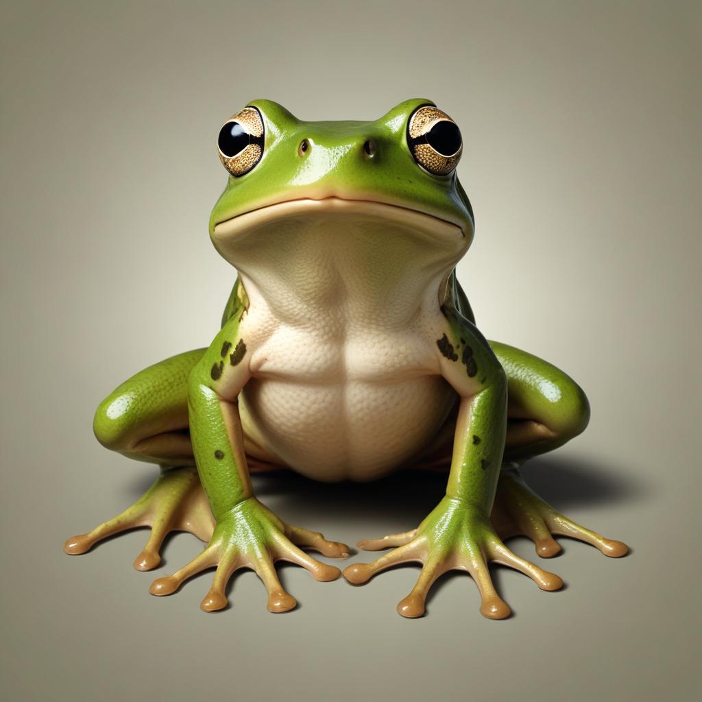 A green frog sits on a plain background