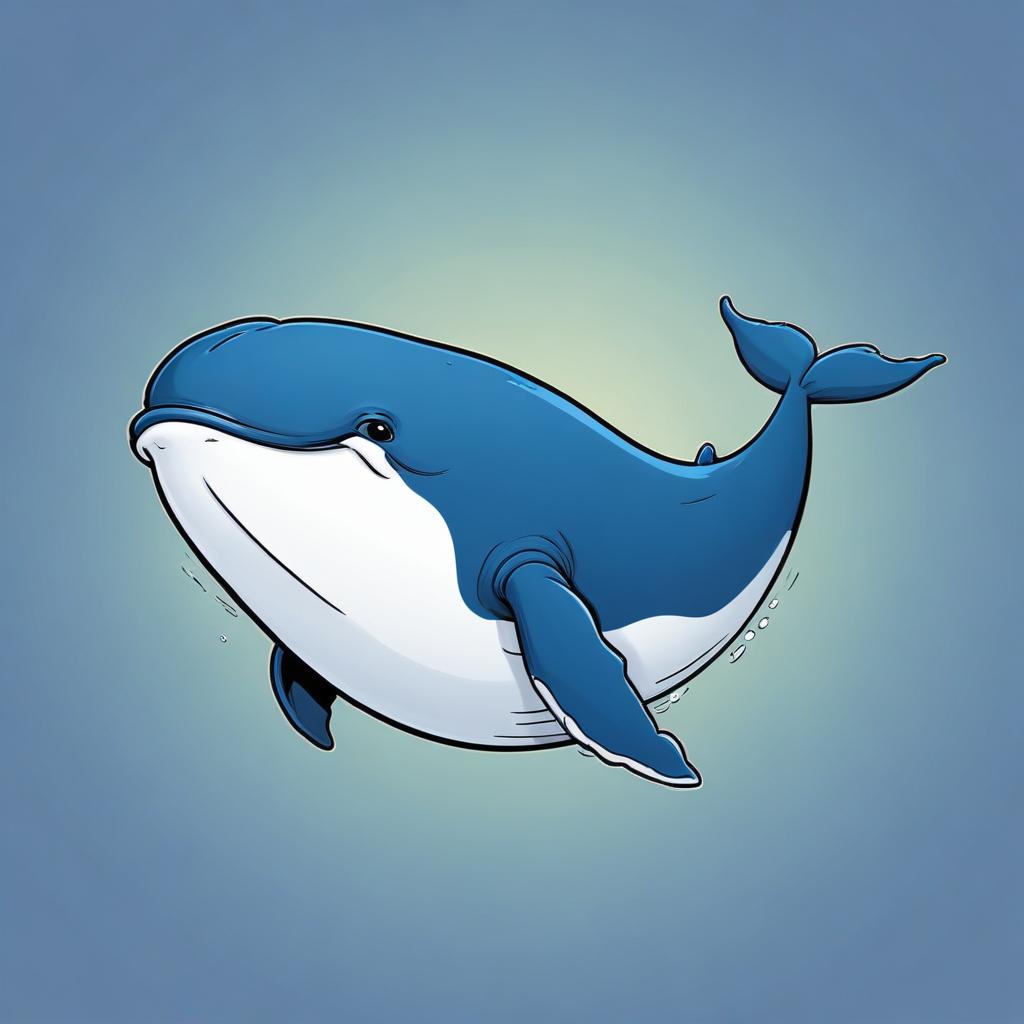A cartoon illustration of a blue whale swimming in the water. The whale is facing the left and has a white underbelly and a blue back