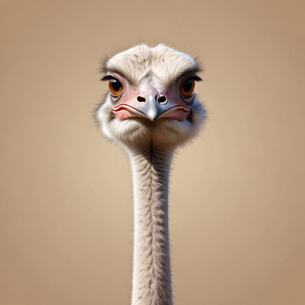 An ostrich with brown eyes looks directly at the camera with a serious expression. It has a long, thin neck and a small, round head.