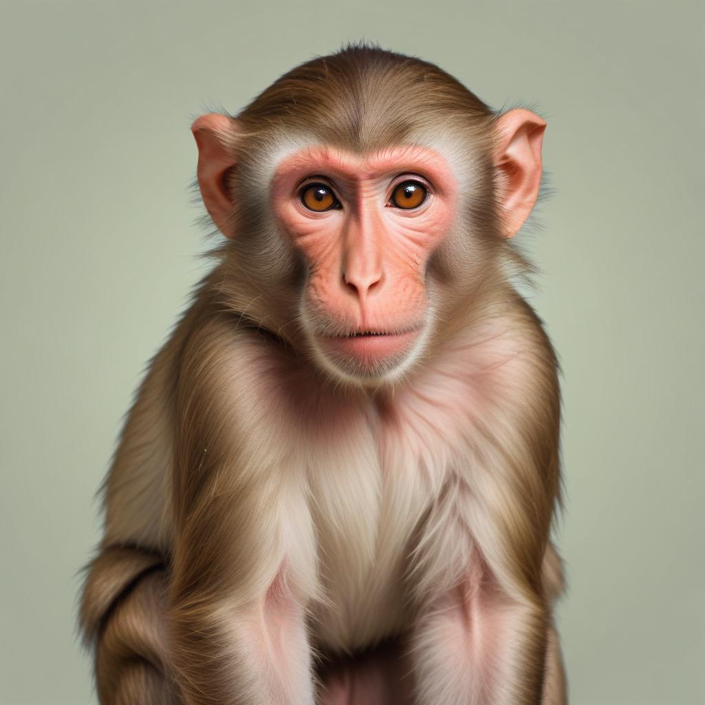 A young monkey sits looking directly at the camera with a serious expression. Its fur is light brown and its face is pink.