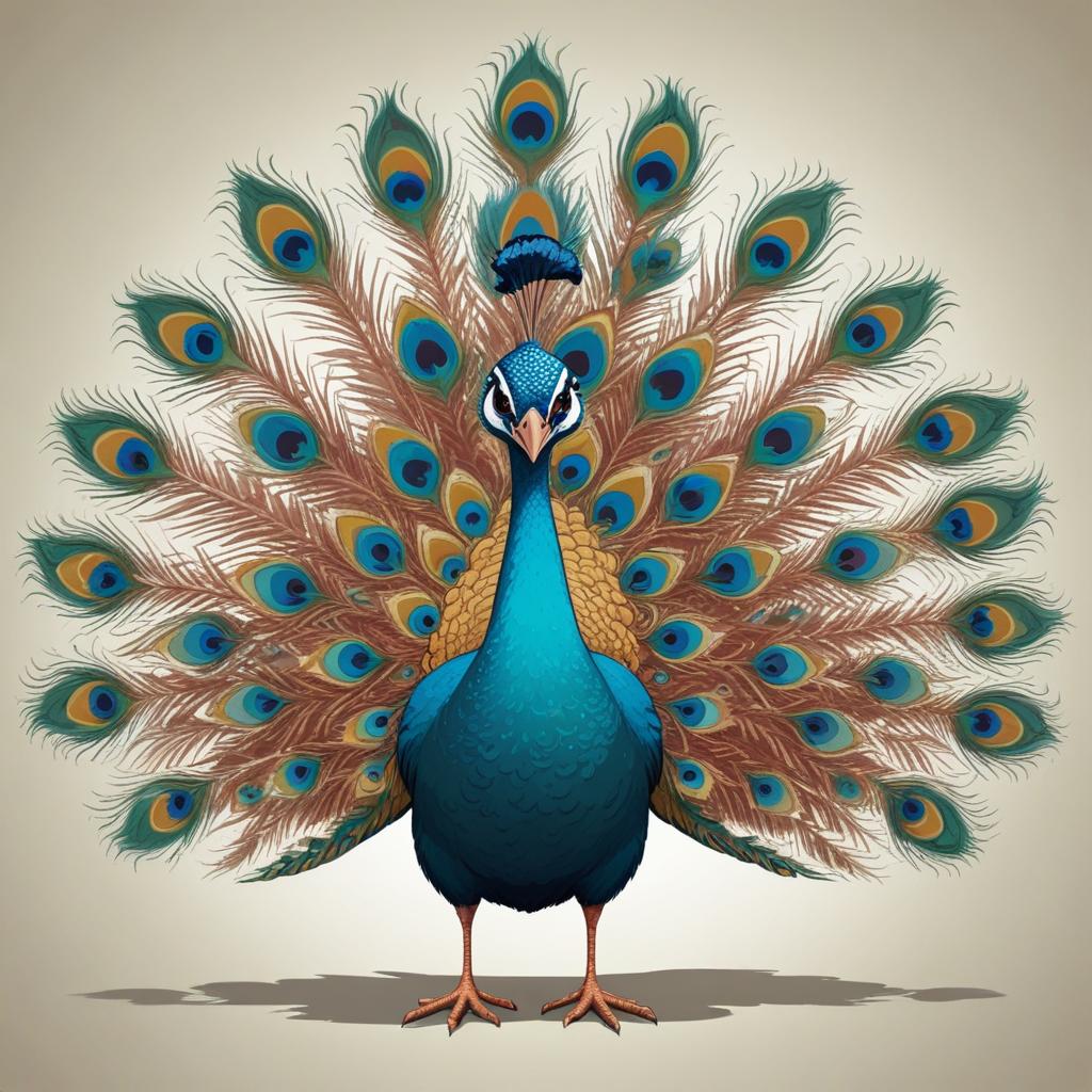 A peacock stands with its tail feathers fanned out in a beautiful display of blue, green, and gold.