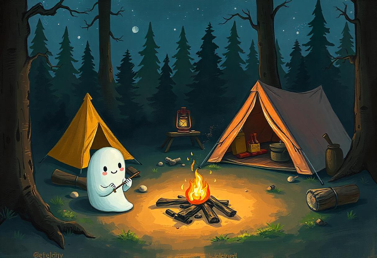 A friendly ghost sits near a campfire in a forest setting. Two tents are pitched nearby, and a lantern shines on a nearby table