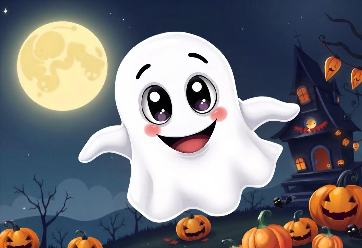 A cartoon ghost with large eyes and a wide smile floats in front of a dark house with jack-o-lanterns on a moonlit Halloween night.