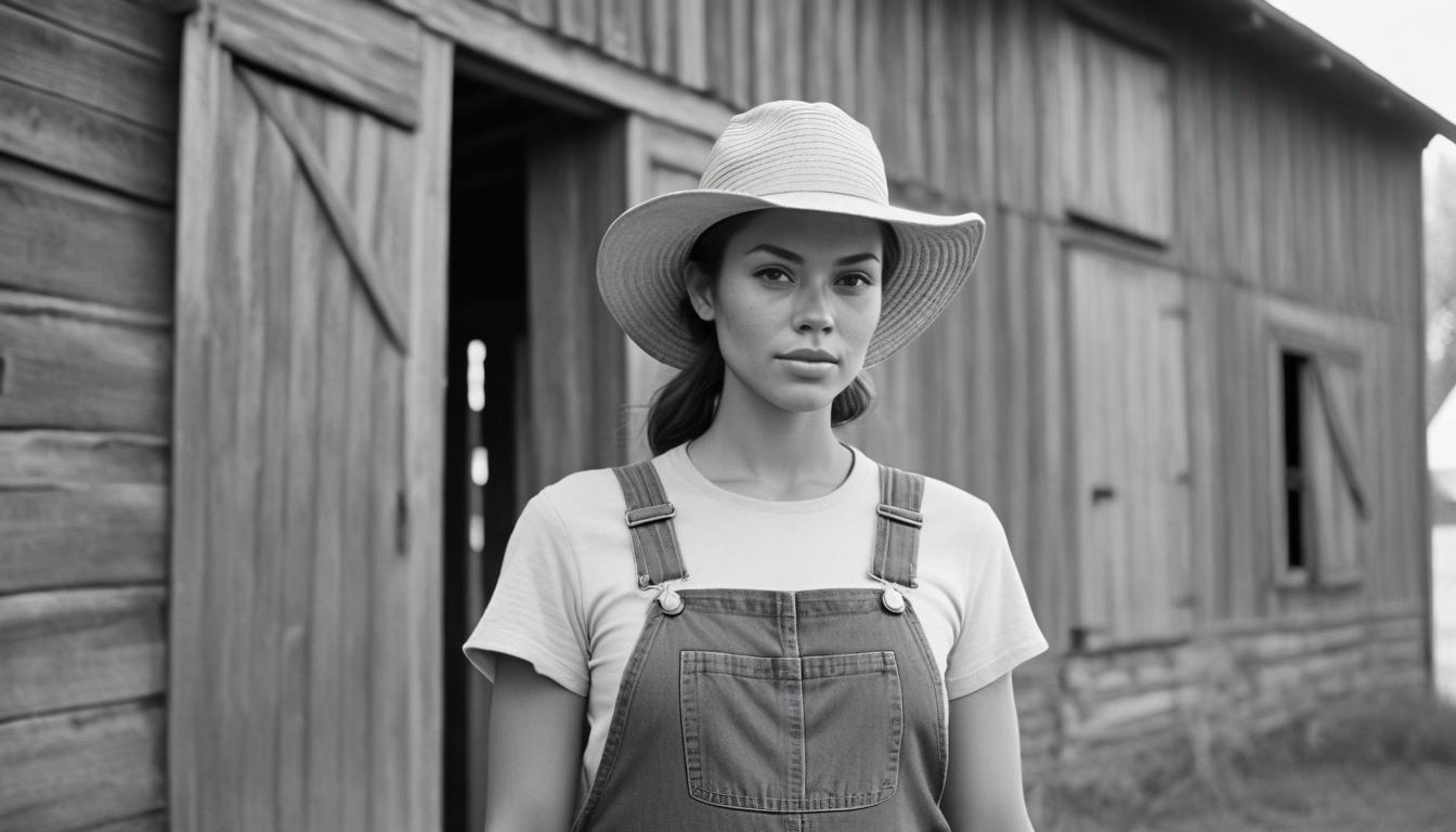 A woman wearing a hat and overalls stands in front of a wooden barn. She looks directly at the camera.