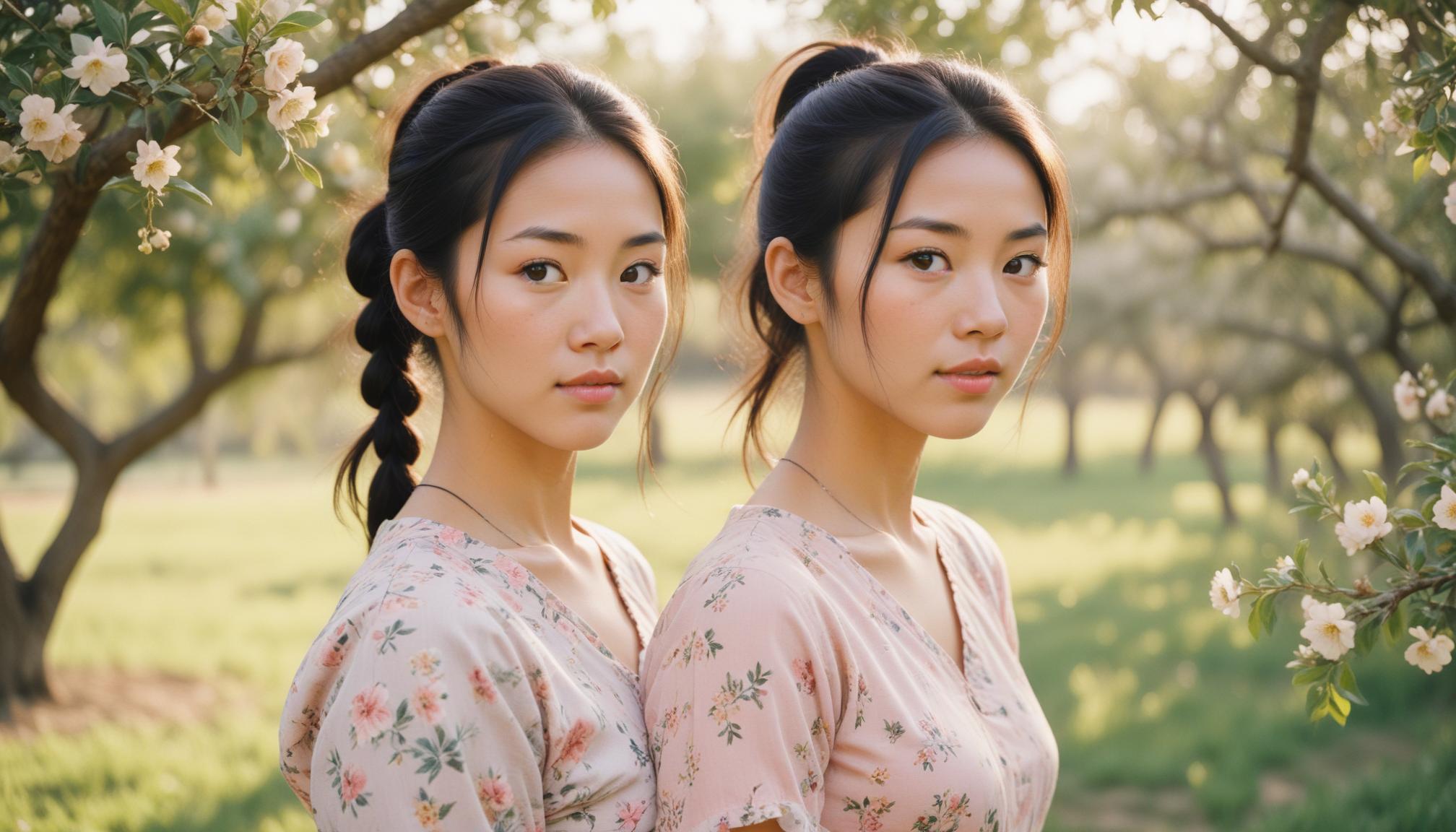Twin sisters pose in a blooming orchard