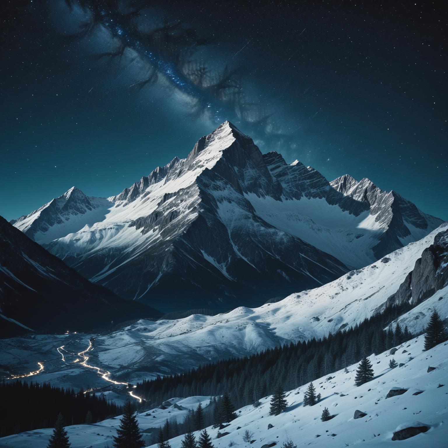 cold, dark, forest, landscape, majestic, milky, mountain, nature, night, peak, range, scenery, sky, snow, stars, trees, valley, way, wilderness, winter