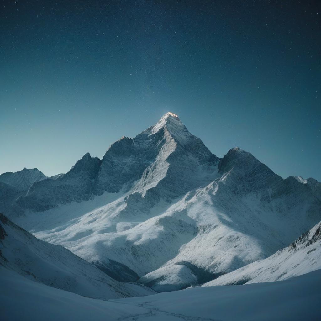 A tall, snow-covered mountain peak is the focal point of this image. The mountain is set against a clear, dark blue sky dotted with stars