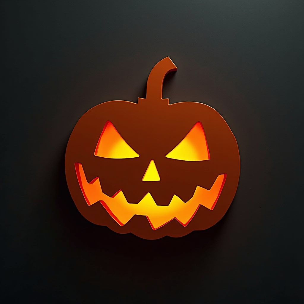 A carved pumpkin with a menacing grin sits on a black background. The pumpkin is lit from within, creating a spooky glow.