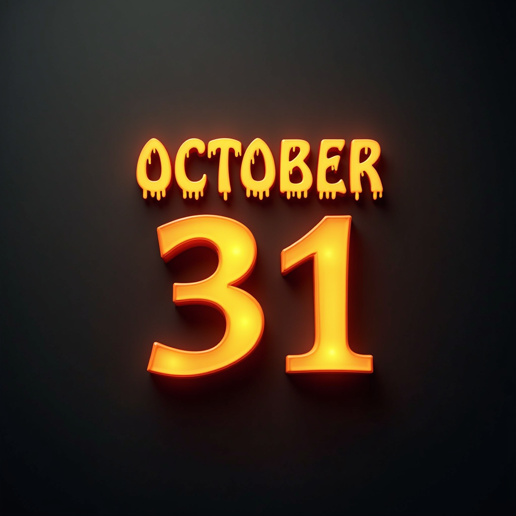 A sign with glowing orange letters spelling out October 31 on a dark background. The font is dripping and appears to be styled for Halloween.
