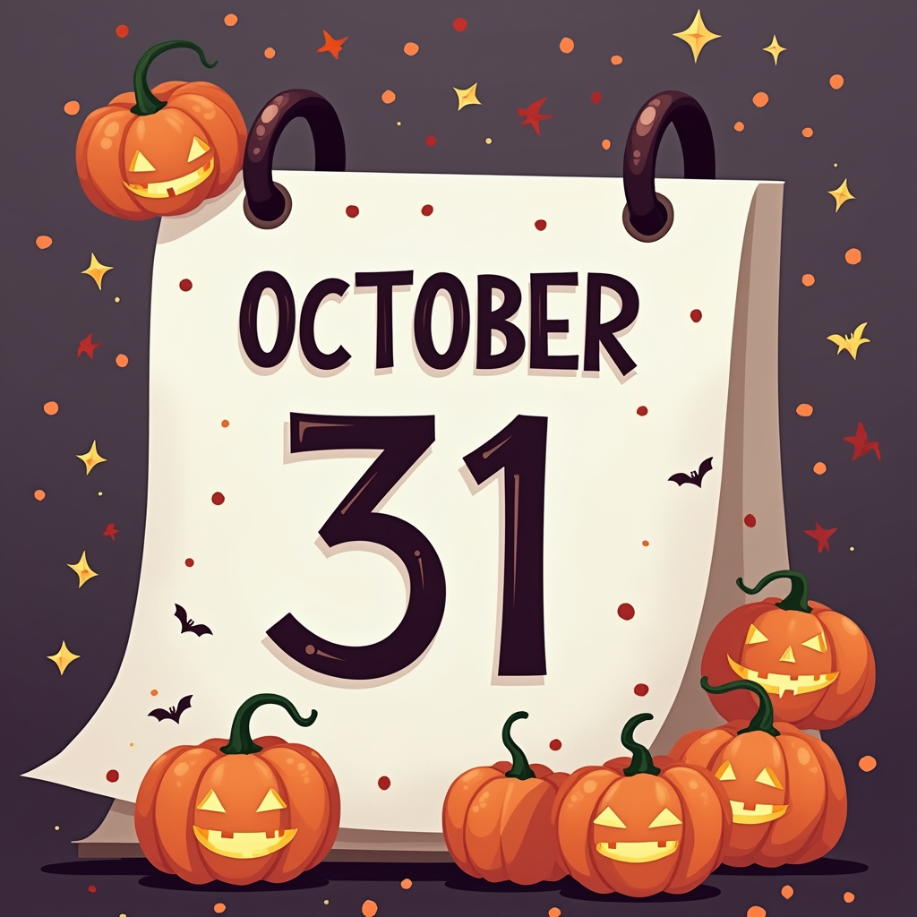 A calendar page shows October 31 with jack-o'-lanterns surrounding it.