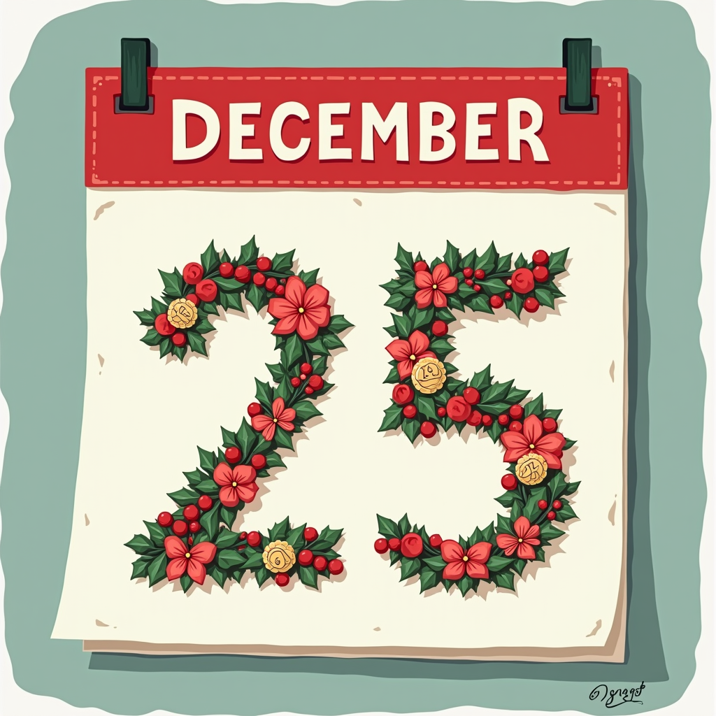 A calendar page showing the date December 25th, with the numbers 25 formed by holly and red berries.