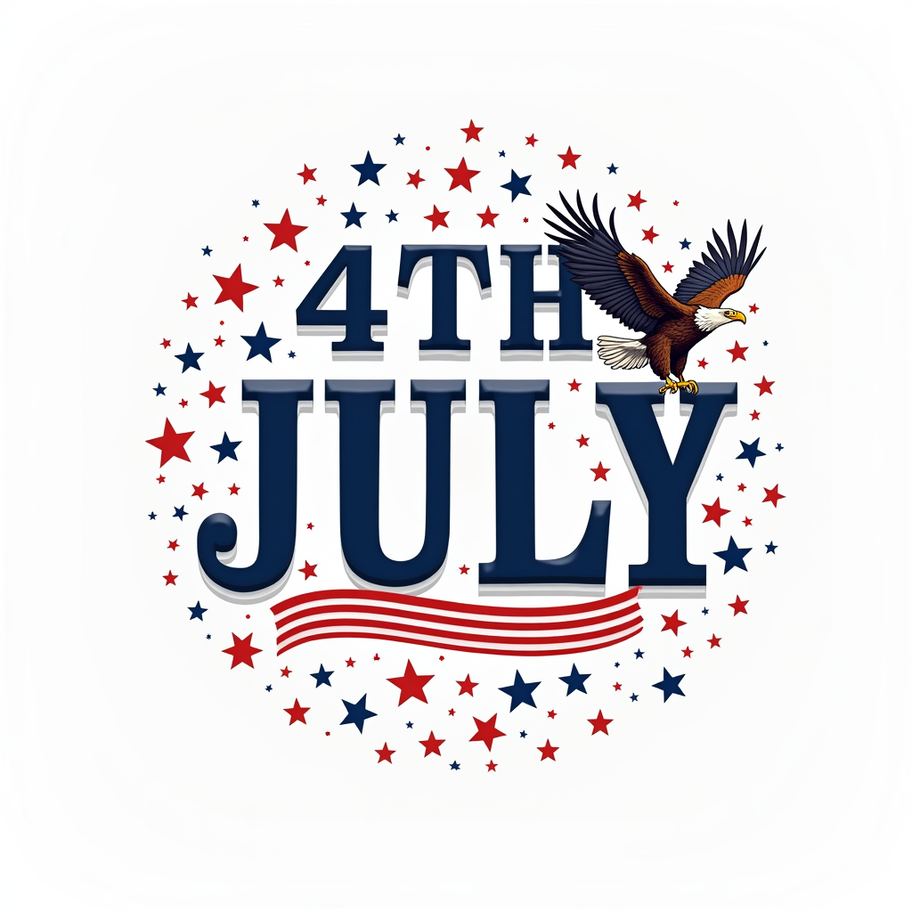 A graphic design of the words 4th of July in blue text with an American eagle flying above the text and red and blue stars surrounding the text.