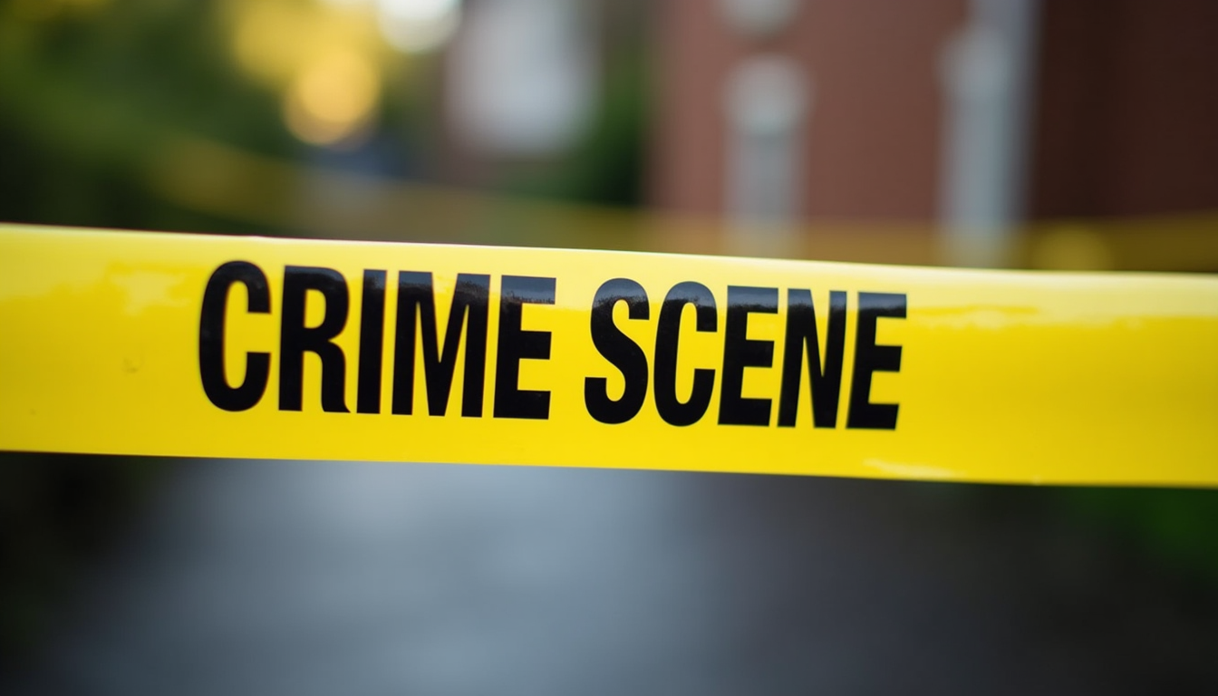 A close-up of yellow crime scene tape stretched across a street, with a blurred background of a residential building.