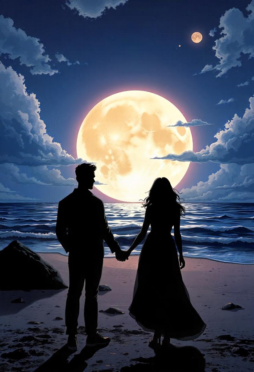 beach, clouds, couple, date, full, hands, hold, love, moon, night, ocean, romance, romantic, sand, silhouette, sky, stars, sunset, water, waves