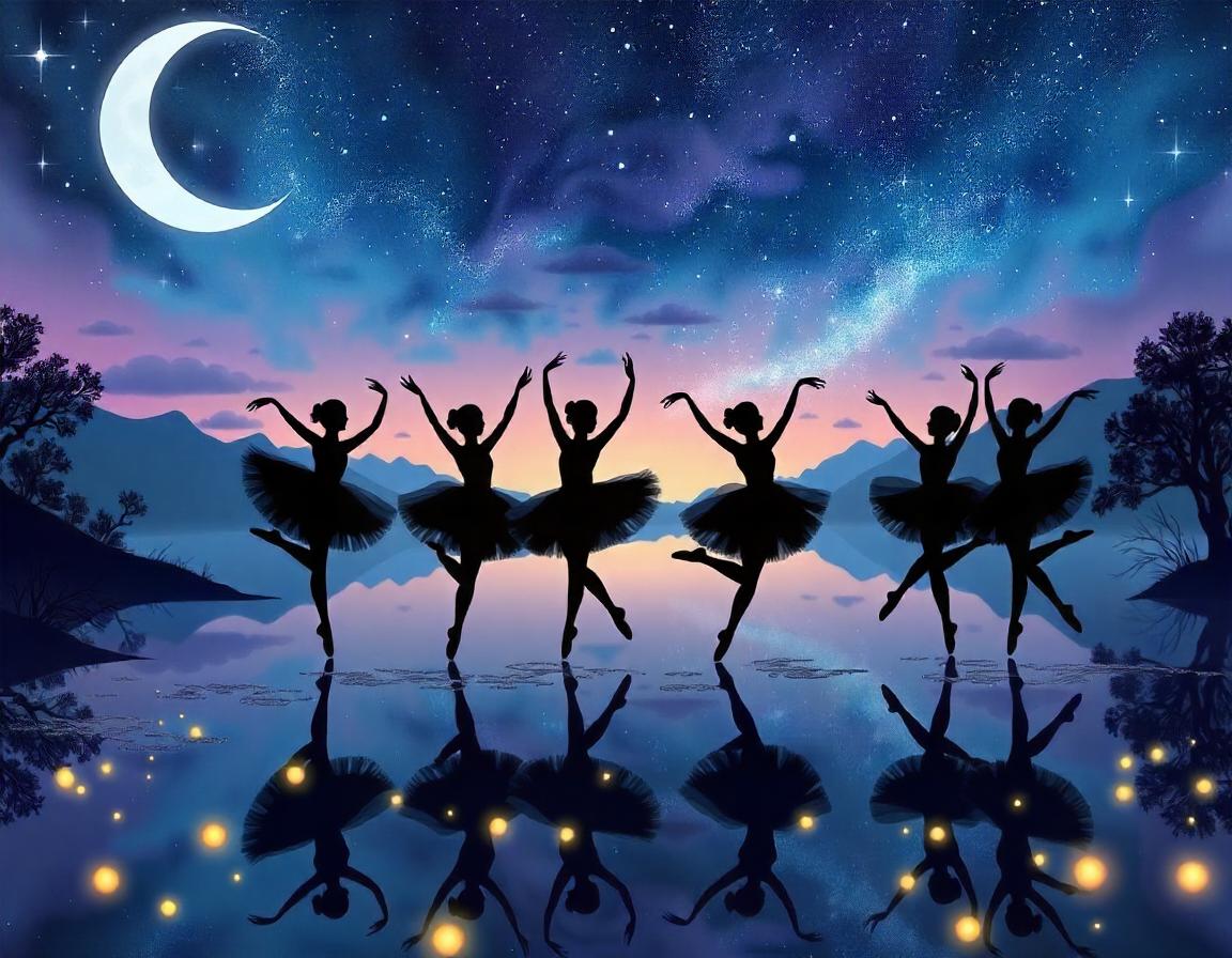 Five silhouetted ballerinas dance on a lake at night under a crescent moon. Their reflections are visible in the water