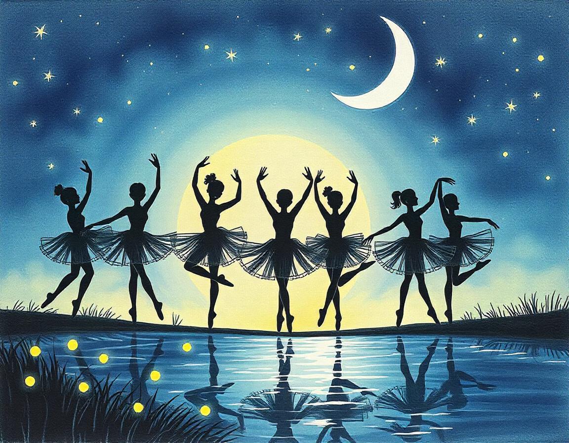 Six silhouettes of ballerinas in tutus dance in a line by a lake with fireflies. There is a crescent moon and stars in the night sky.