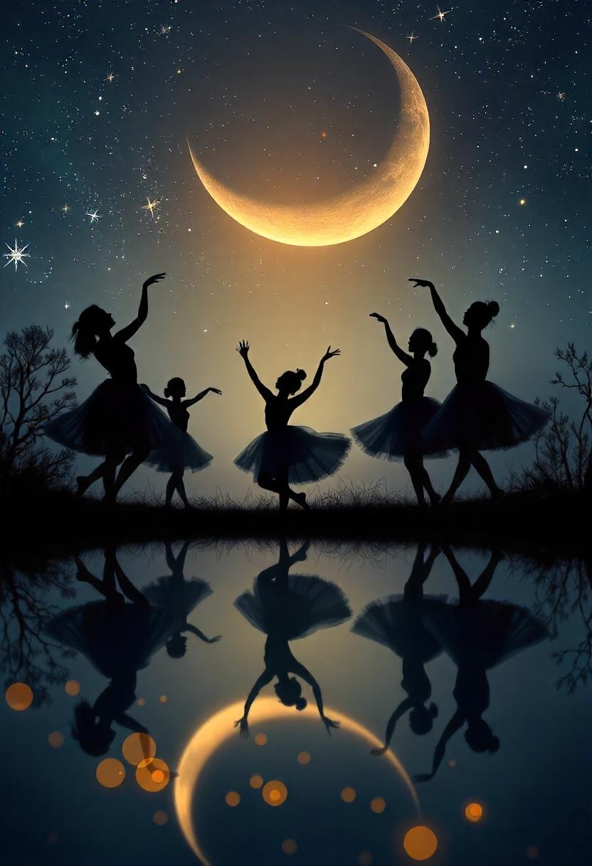 Four ballerinas dance under a crescent moon