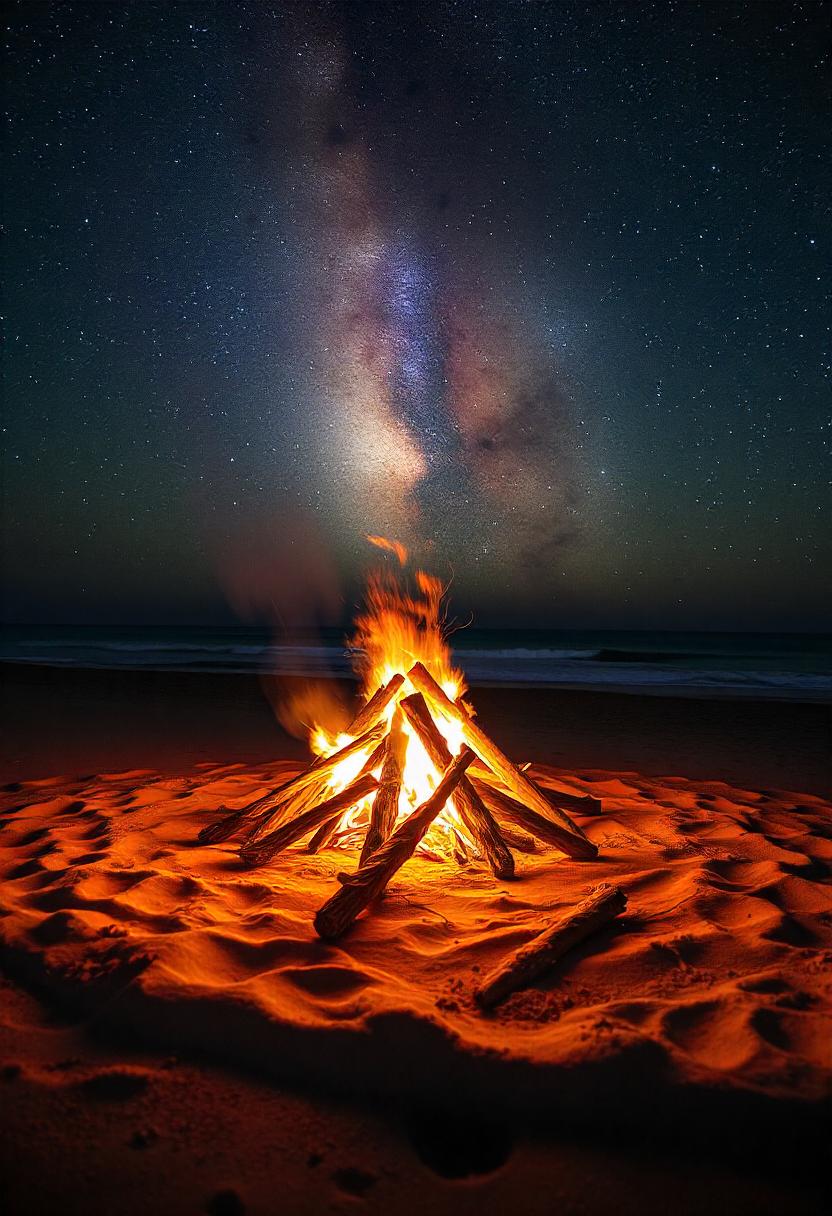 adventure, beach, campfire, camping, fire, galaxy, milky, nature, night, ocean, outdoors, relaxation, romantic, sand, sky, stars, travel, warm, way, wood
