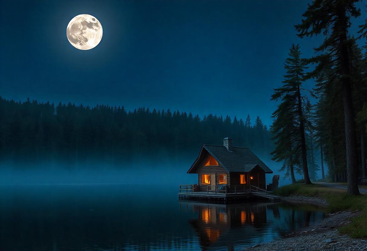 cabin, dark, forest, full, lake, landscape, magical, moon, mystical, nature, night, peaceful, quiet, reflection, romantic, serene, sky, trees, water, woods