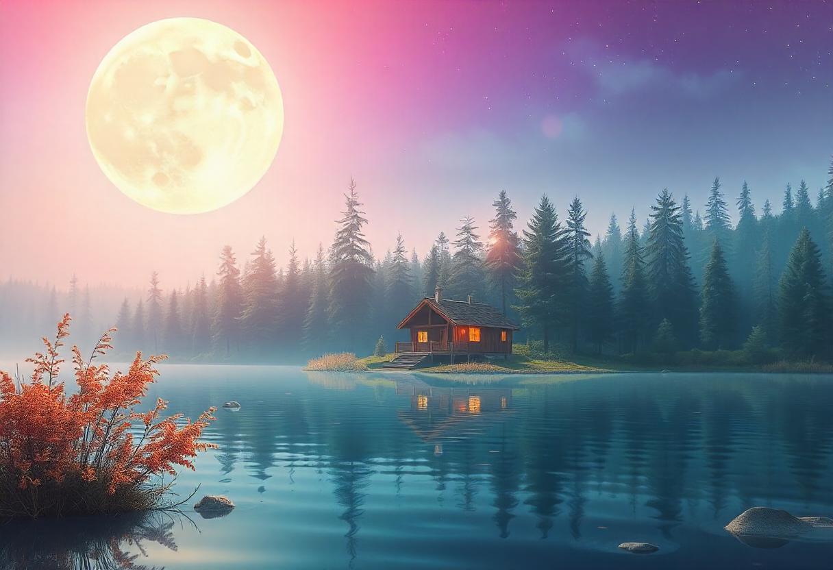 A cabin sits peacefully by a lake under the full moon