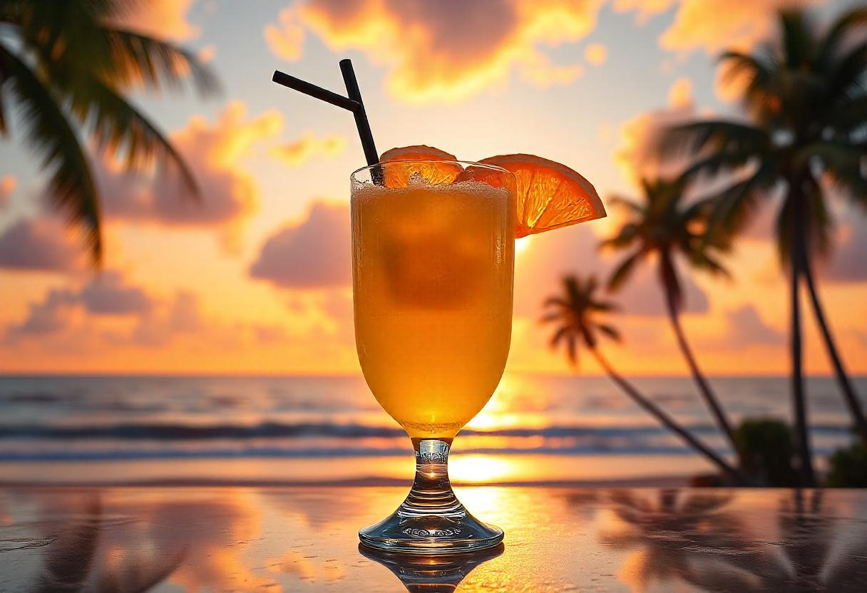 A tall glass of orange juice with a slice of orange sits on a bar table overlooking the beach at sunset