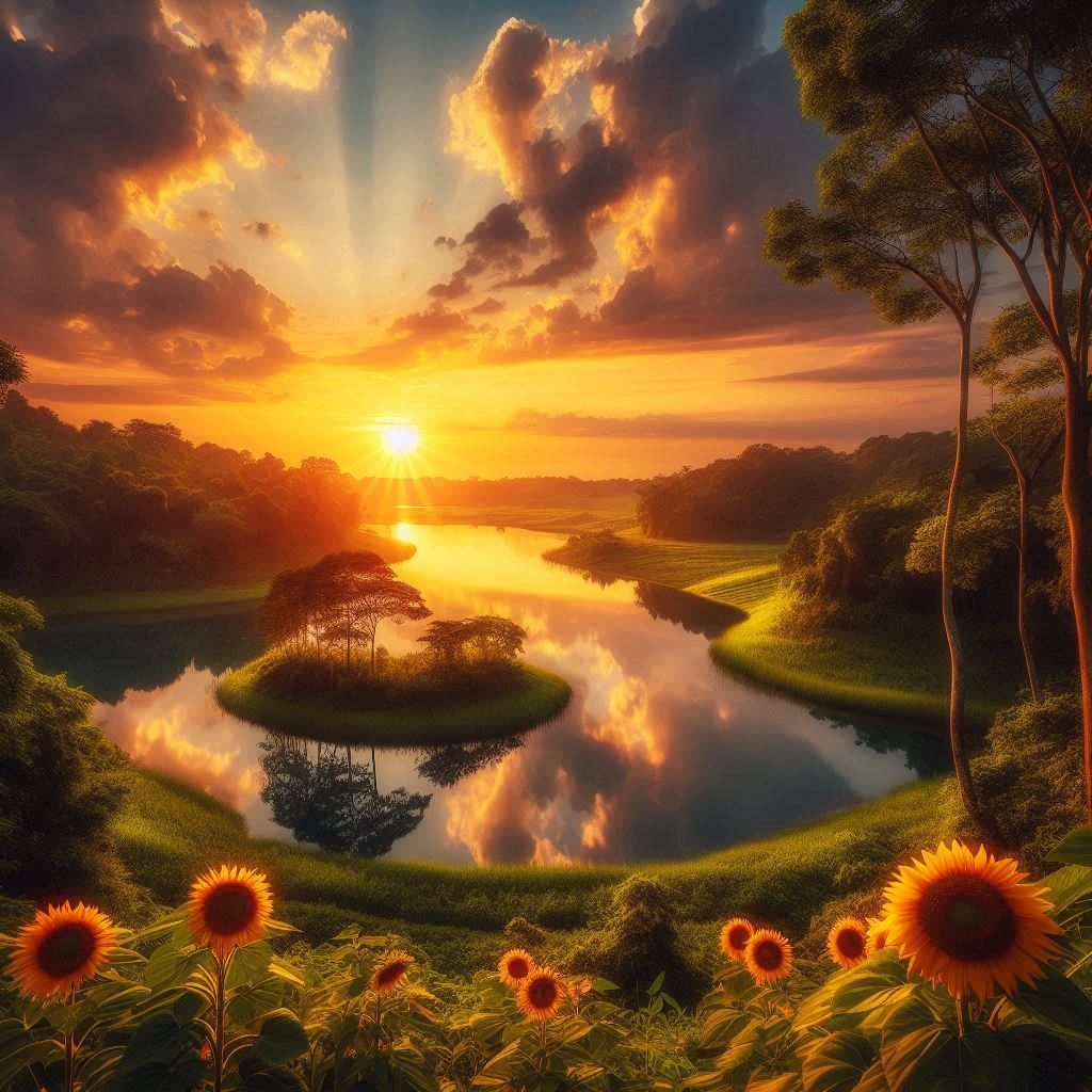 A wide river flows through a lush valley, its waters reflecting the vibrant orange and yellow hues of the setting sun