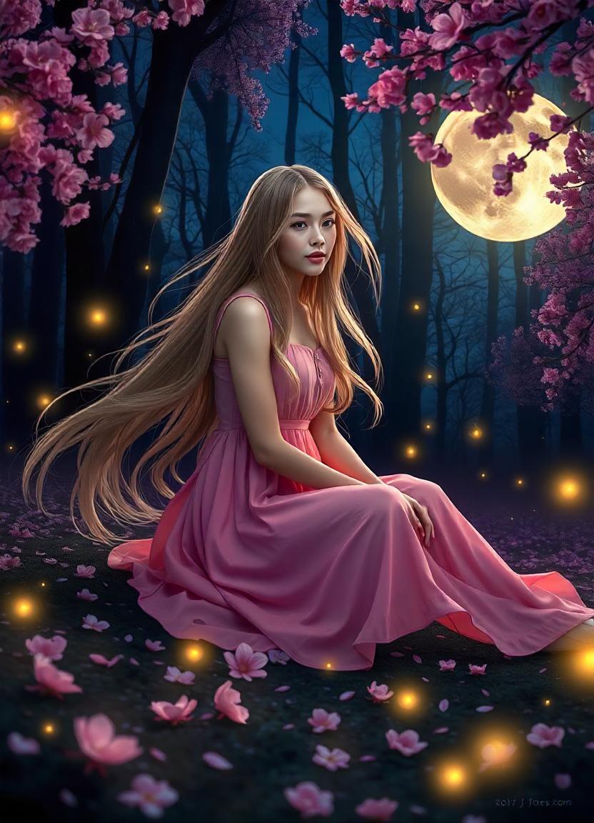 beauty, blossom, dark, dream, dress, fairy, fantasy, fireflies, flowers, forest, full, magical, moon, nature, night, peaceful, pink, sitting, trees, woman
